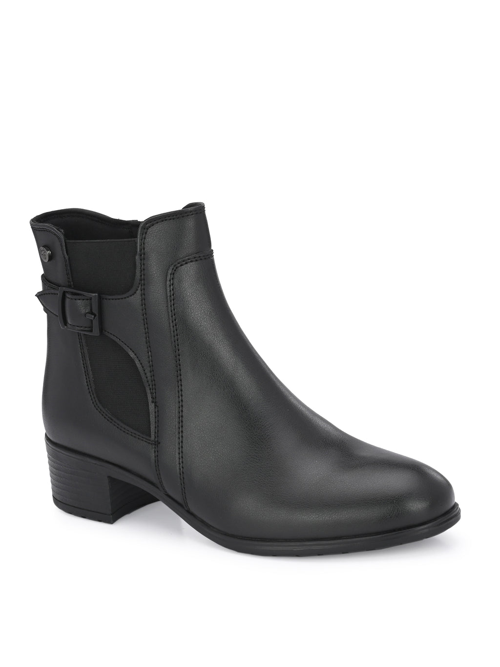 Women's vegan leather low heeled chelsea ankle boots with buckle strap detail. Inside zip to wear easily. Fabric lining and memory foam insock for ultimate comfort.