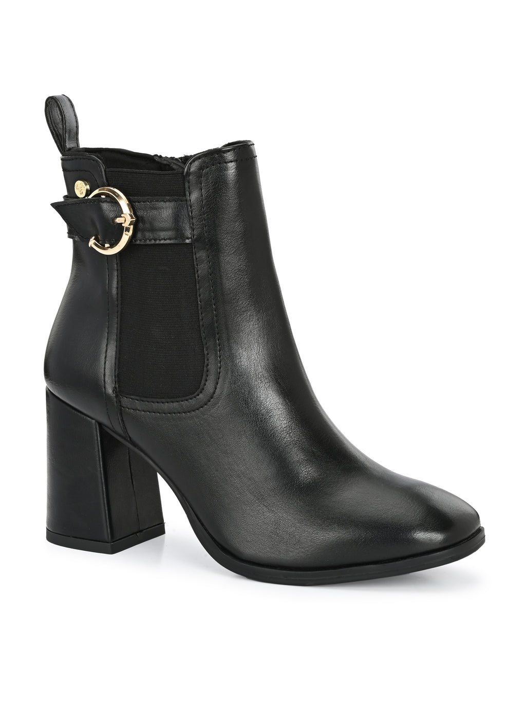 Black women’s vegan leather, square toe, high heel, ankle chelsea boots with buckle and back loop detail. Inside zip to wear easily. Fabric lining and memory foam insock for ultimate comfort.