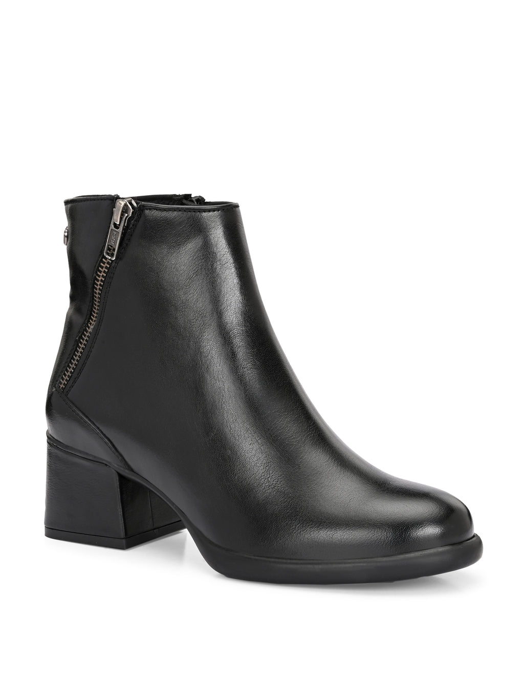 Black women’s vegan leather , mid heel ankle boots with outside metallic zip detail. Inside zip to wear easily. Fabric lining and memory foam insock for ultimate comfort.