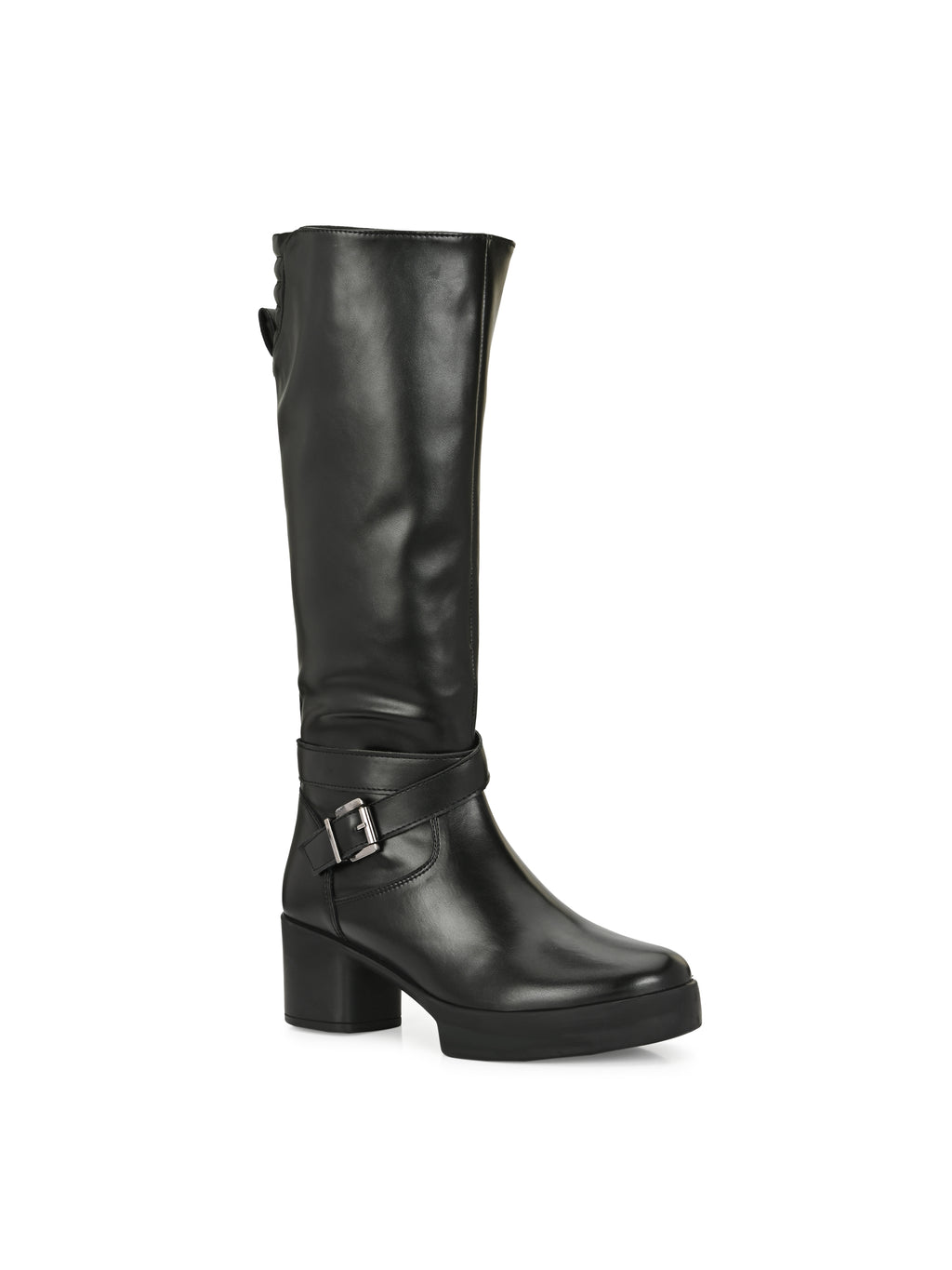 Woman vegan leather, mid heel, platform outsole, knee high boots with ankle buckle strap and quilted back collar with loop detail. Has inside zip to wear easily. Fabric lining and memory foam insock for ultimate comfort.