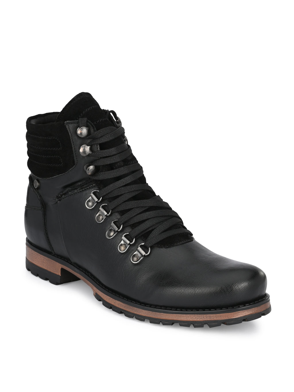 Men vegan leather and suede leather boots with top stitching detail and cushioned collar. Five D-rings and three hooks facing. Fabric lining and memory foam insock for ultimate comfort. Upper Material: Faux Leather, Sole: TPR
